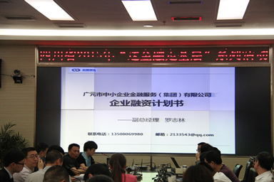 4月28日,省金融办在广元市政府一会议室举行了四川省2015年“送金融走基层”系列活动之挂牌融资专场活动。在活动中,市金融服务集团、广元市海天实业有限公司等六家企业进行了融资计划书PPT路演,与会省市领导、专家组、投资人畅谈了参观企业后的感想,并就各企业发展方向和如何利用资本市场进行融资提出了建设性意见。副总经理罗志林现场解答了与会领导、专家的询问,接受了个别投资者的咨询。