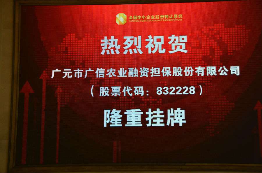 5月22日,市国资委党委副书记、主任肖光林一行参加了在全国中小企业股份转让系统有限责任公司举行的“集体挂牌仪式”。挂牌仪式上,主任肖光林代表挂牌企业地方领导致辞,并由公司董事长李仕平敲响了广信担保股份公司的开市宝钟。