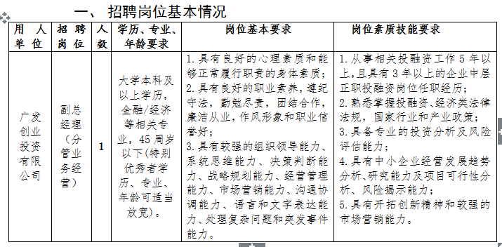 广元市国有资产监督管理委员会下属国有企业广元市中小企业金融服务(集团)有限公司,是市政府于2013年3月7日注册成立的国有独资金融服务企业,注册资本1亿元,资产总额5亿余元,旗下5家控股子公司:广元市广信农业融资担保股份有限公司、广元市朝天国信小额贷款有限公司、广元市广发创业投资有限公司、广元达信产权交易服务有限责任公司、广元创富互联网金融服务股份有限公司。现因业务发展需要,决定面向社会公开招聘子公司副总经理1名,现将相关事项公告如下: