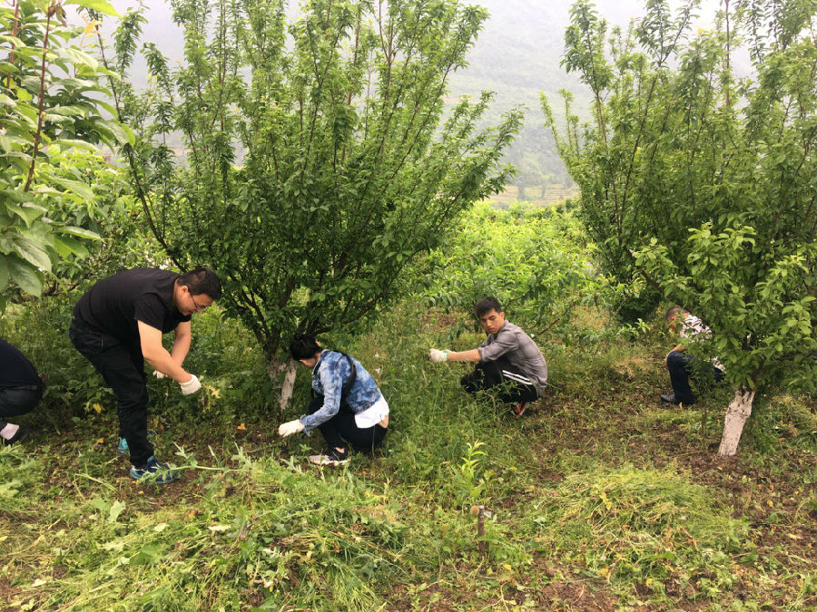青川县白家乡马村贫困户张学明种植了一片果树,以增加家庭经济收入,当下正值挂果时节,家庭劳动力严重不足,果园荒草丛生。5月4日,广元金服集团党员、团员来到马村开展主题党日(团日)活动——帮助张学明家果园除草。