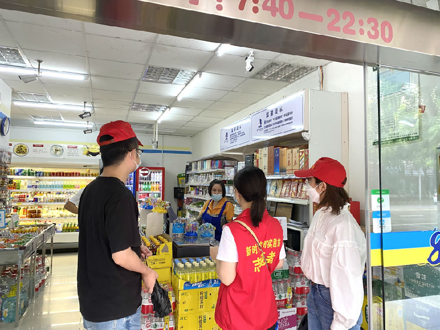 上午8:30,全体志愿者冒着滂沱大雨准时到达南鹰社区党群服务中心集合,分成五个小组,协助社区疫情防控工作人员对西安路、郑州路、广州路、北京路及滨河南路沿街商铺和居民小区进行疫情防控宣传,督促各商户每天营业前使用酒精、消毒液进行全面消毒,配备体温计,所有营业人员佩戴口罩,切实做好防疫保障工作;提醒消费者在疫情期间勤洗手不聚集不扎堆,正确佩戴口罩、保持1米距离,时刻做好个人防控措施。