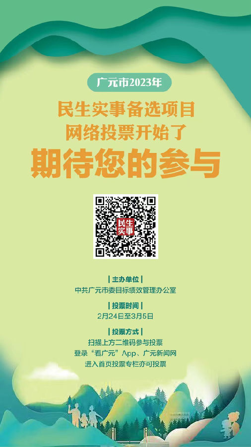 2023年市定民生实事备选项目网络投票开始了,欢迎您登陆“看广元”APP、广元新闻网,进入首页投票专栏参与投票。