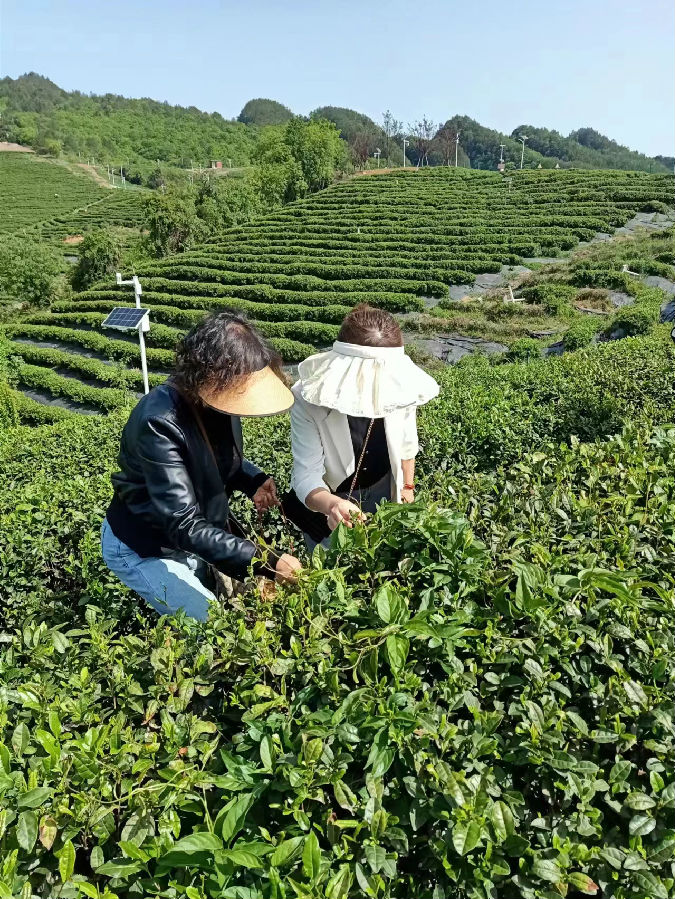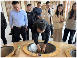 活动中,党员干部们参观了“剑门·蜀道茶叶生态公园”一期建设项目,在茶园负责人的带领和讲解下,大家认真学习了采茶技艺,并亲身体验采摘活动。党员们腰系小竹篓,穿梭于茶树丛中,双手“一捏、一提、一放”在茶树上来回飞舞,在共同的劳作中拉近了彼此心灵的距离。随后,大家带着新采的茶叶来到茶叶加工坊,在制茶师傅的指导下,悉心学习手工制茶的工序,了解各种制茶用具和注意事项,在反复的翻、炒、揉的过程中,体味深厚茶文化。