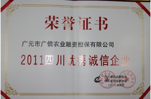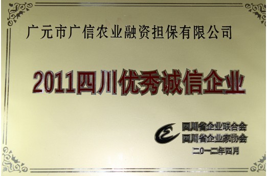 广信担保公司荣获“2011四川优秀诚信企业”荣誉称号。2011年11月23日,公司向省企业联合会、企业家协会递交了参选“2011四川优秀诚信企业”申报材料。2012年2月16日,省业联合会、企业家协会梁秘书长一行到公司实地考察,听取了公司关于诚信建设的汇报,对公司成立5年来以“推进社会诚信建设为己任,主动担负社会责任”所取得的成绩给予了高度评价。之后,省业联合会、企业家协会通过专家评审、社会公示、征求意见、接受举报投诉等程序,确定公司当选为“2011四川优秀诚信企业”。2012年4月27日,省业联合会、企业家协会召开了表彰大会,公司荣获“2011四川优秀诚信企业”荣誉称号。