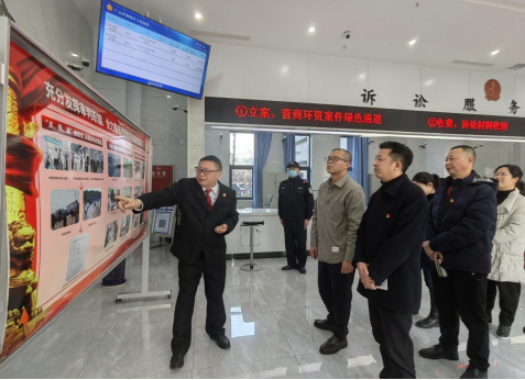 伏勇庭长详细介绍了法庭建设、党建工作、司法服务营商环境优化等方面的情况,并带领大家参观了党建阵地、诉讼服务中心、郭兴利工作室和审判庭等。
